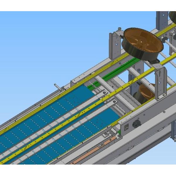 The bottle feeding conveyor is responsible for conveying the cans/bottles to the bottle separation mechanism. The conveyor belt adopts the Regina 610 series mesh belt. The fully enclosed top surface can provide excellent product support, avoid bottle fall, and is durable; at the same time, the use of a small pitch mesh chain is more conducive to the smooth transition of the product at the conveying end. The control and the main machine form a pressure-free conveying relationship, which is conducive to the bottle group arrangement. The swing cylinder buffer component makes the bottle feeding smoother. The bottle feeding conveyor is divided into two sections, front conveyor and rear conveyor, which can effectively relieve the pressure of bottle feeding.